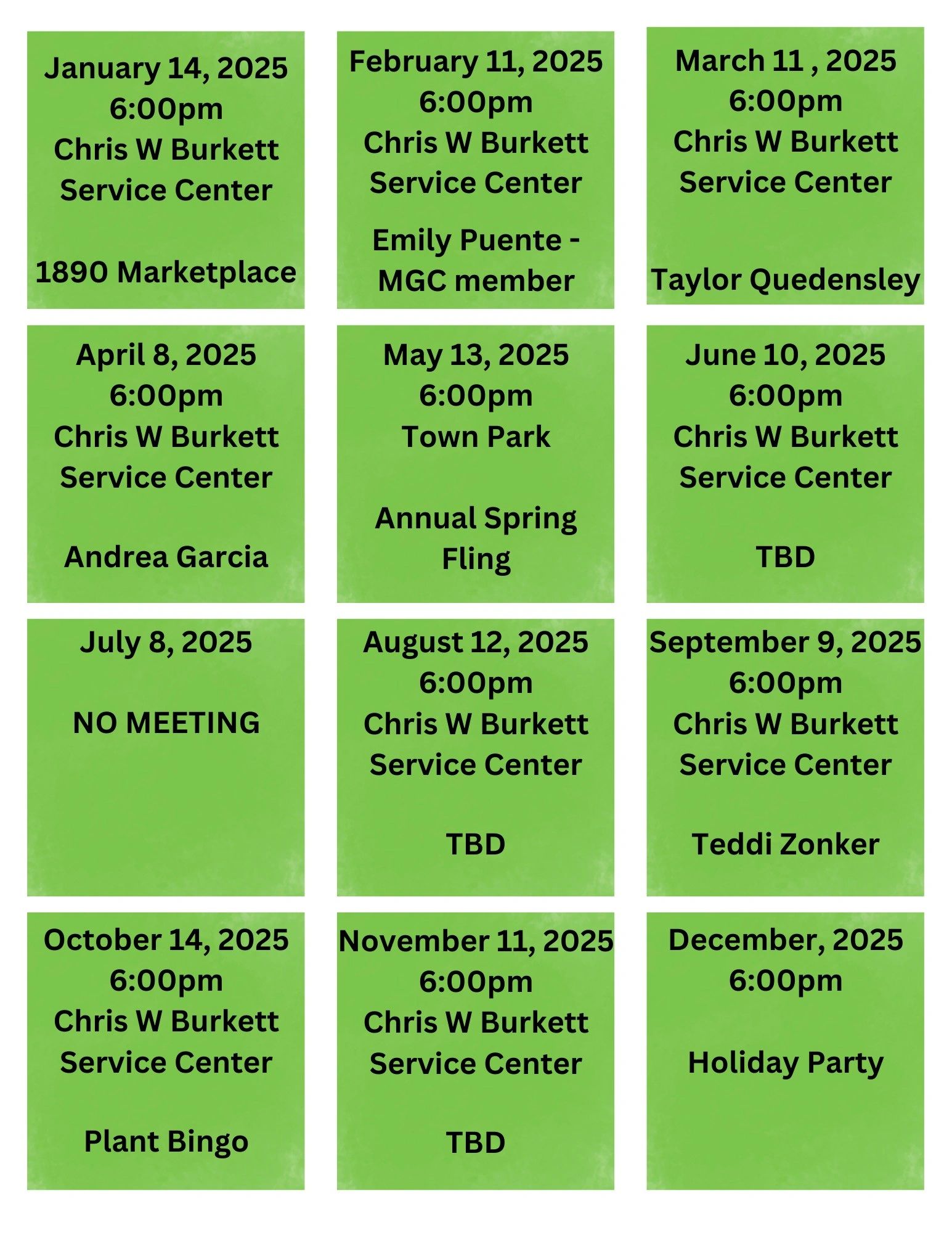 MGC meets once a month. Our meetings are usually at the Chris W. Burkett Service Center at 620 S. Wisteria, Mansfield. Social time starts at 6:00pm and meeting/speaker starts at 6:30pm. We are an active club with something going on several times a month - community projects, fieldtrips and meetings.